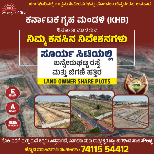 ಇದು ನಗರದ ಹೊರವಲಯದ ಸೂರ್ಯ ಸಿಟಿ ಬಡಾವಣೆ. ಈಗಾಗಲೇ ಕರ್ನಾಟಕ ಗೃಹ ಮಂಡಳಿಯ ಮಾರ್ಗದರ್ಶನದಲ್ಲಿ ಬಡಾವಣೆಗಳು, ಫ್ಲಾಟ್ಗಳು ನಿರ್ಮಾಣವಾಗಿದ್ದು, ವಾಸಿಸಲು ಯೋಗ್ಯವಾದ ಸ್ಥಳ ಎಂದು ಸಾಬೀತಾಗಿದೆ. ಇದೇ ಸ್ಥಳದಲ್ಲೀಗ ಮತ್ತೊಂದು ಅವಕಾಶವನ್ನು ಕರ್ನಾಟಕ ಗೃಹ ಮಂಡಳಿ ಮಾಡಿಕೊಡುತ್ತಿದ್ದು, ಬೆಂಗಳೂರಿನ ಆನೇಕಲ್ ಹಾಗೂ ಎಲೆಕ್ಟ್ರಾನಿಕ್ ಸಿಟಿ ಹತ್ತಿರ ಏಷ್ಯಾದ ಅತಿ ದೊಡ್ಡ ರೆಸಿಡೆನ್ಶಿಯಲ್ ಲೇಔಟ್ ಆಗಿರುವ ಸೂರ್ಯ ಸಿಟಿ ಬಡಾವಣೆಯಲ್ಲಿ ಕೆಹೆಚ್ಬಿ ನಿರ್ಮಾಣ ಮಾಡಿರುವ ನಿಮ್ಮ ಕನಸಿನ ನಿವೇಶನಗಳು ಅಂದರೆ ಈ ಬಡಾವಣೆಯಲ್ಲಿ ಭೂ ಮಾಲೀಕರ ಪಾಲಿನಲ್ಲಿರುವ (Land Owner) ಸೈಟುಗಳು ಲಭ್ಯವಿದೆ.