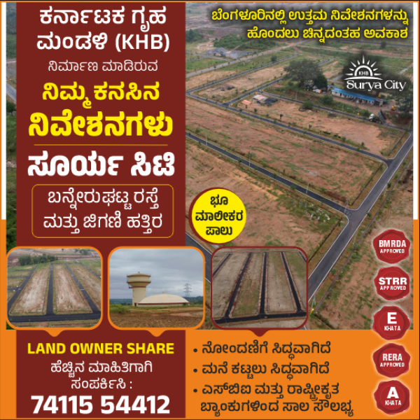 36 ಸಾವಿರ ಪ್ರೀಮಿಯಂ ನಿವೇಶನಗಳನ್ನು ಹೊಂದಿರುವ ಸೂರ್ಯ ಸಿಟಿ ಬಡಾವಣೆ ಬೆಂಗಳೂರಿಗೆ ಕರ್ನಾಟಕ ಸರಕಾರದ ಗೃಹ ಮಂಡಳಿಯಿಂದ ಬಹುದೊಡ್ಡ ಕೊಡುಗೆ. ಆನೇಕಲ್, ಜಿಗಣಿ ಮತ್ತು ಬನ್ನೇರುಘಟ್ಟ ರಸ್ತೆಯಲ್ಲಿರುವ ಜಿಗಣಿ ಕೈಗಾರಿಕಾ ಪ್ರದೇಶದ ಸ್ವಾಮಿ ವಿವೇಕಾನಂದ ರಸ್ತೆ ಮಾರ್ಗದಲ್ಲಿರುವ ವ್ಯಾಸ ಆರೋಗ್ಯಧಾಮ, ಪ್ರಶಾಂತಿ ಕುಟೀರಮ್ ಮತ್ತು ವಿವೇಕಾನಂದ ಕೇಂದ್ರ ವಿದ್ಯಾಲಯ, ಸ್ವ್ಯಾಸ ಯೋಗ ಯೂನಿವರ್ಸಿಟಿ ಗೆ ಹೊಂದಿಕೊಂಡಿರುವ ಸೂರ್ಯ ಸಿಟಿ ಬಡಾವಣೆಯಲ್ಲಿ KHB ಅಭಿವೃದ್ಧಿಪಡಿಸಿದ ಸುಜ್ಜಿತವಾದ ಗೃಹ ವಸತಿ ನಿವೇಶನಗಳು, ಭೂಮಾಲೀಕರ ಪಾಲಿನ ಸೈಟುಗಳು ಲಭ್ಯವಿದೆ. (Land Owner Share Sites) ಇಲ್ಲಿ ನಿಮ್ಮ ಮನೆಯ ಕನಸನ್ನು ನನಸಾಗಿಸಿಕೊಳ್ಳಲು ಅಪೂರ್ವ ಅವಕಾಶ ಒದಗಿದೆ.